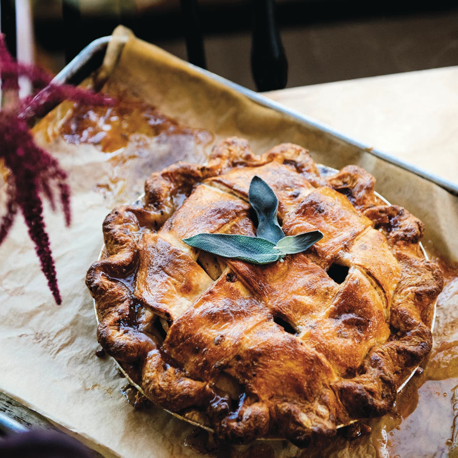 Crisp apples are folded with brown sugar, fresh sage, and a hint of warm spice, baked inside an ultra-flaky aged Gouda crust made with European butter. Sweet, savory, and delicately aromatic — each slice balances buttery richness with the bright comfort of baked apples and herbs. A refined twist on Thanksgiving tradition.