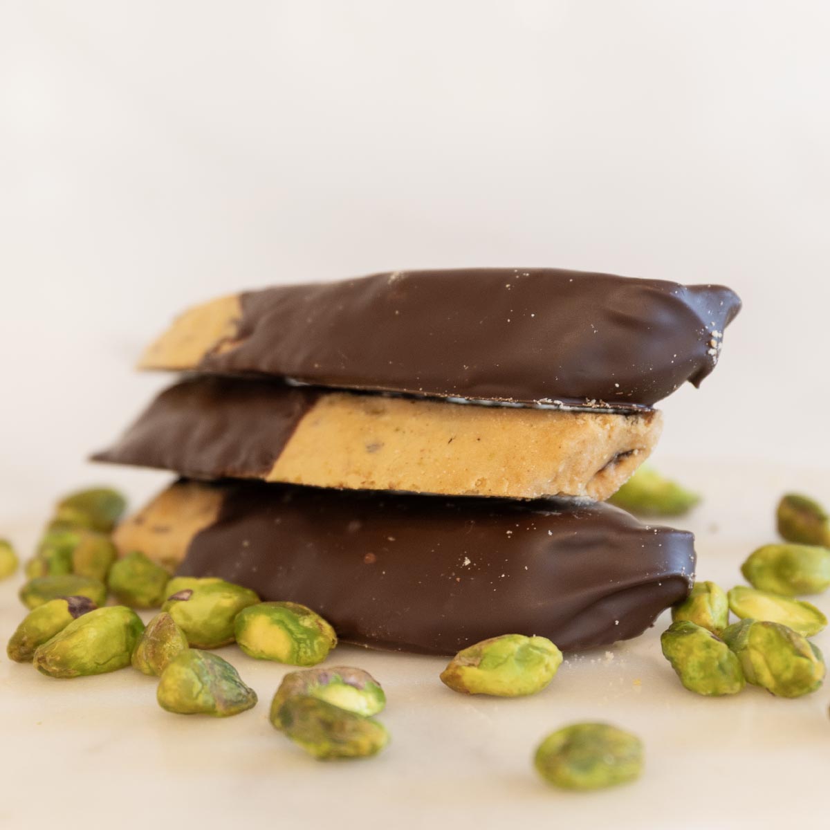 Crunchy twice-baked biscotti studded with tart cranberries and roasted pistachios, half-dipped in smooth dark chocolate.
