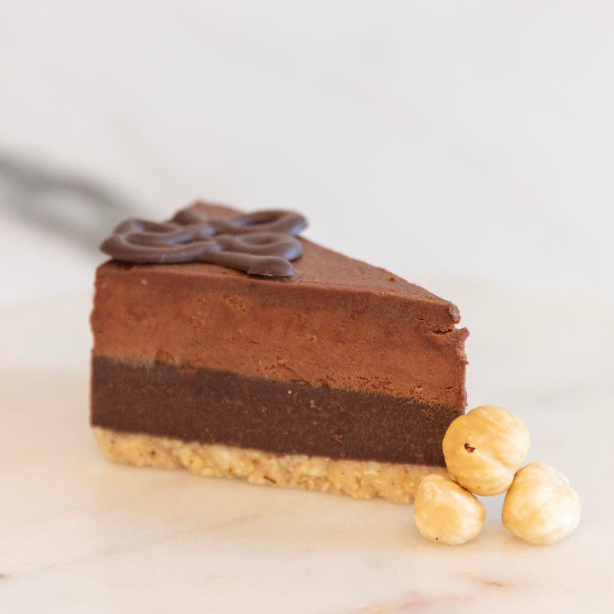 Layers of crushed hazelnut and almond, chocolate amaretto, and a mocha top, crafted for a rich balance of nut, cocoa, and coffee. (GF)