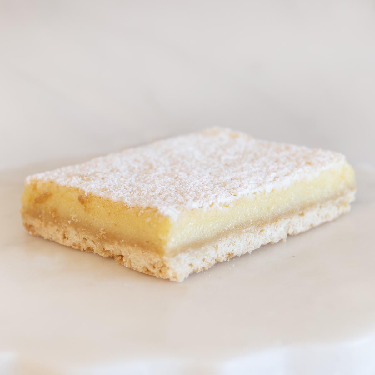 Buttery shortbread crust topped with a smooth, tangy lemon filling and a dusting of powdered sugar.